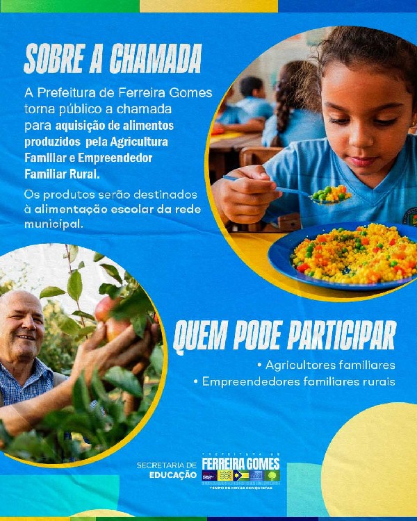 A Prefeitura Municipal de Ferreira Gomes, por intermédio da Secretaria Municipal de Educação, torna público que está aberta a Chamada Pública do Programa Nacional de Alimentação Escolar (PNAE), destinada à aquisição de gêneros alimentícios oriundos da agricultura familiar e do empreendedor familiar rural.