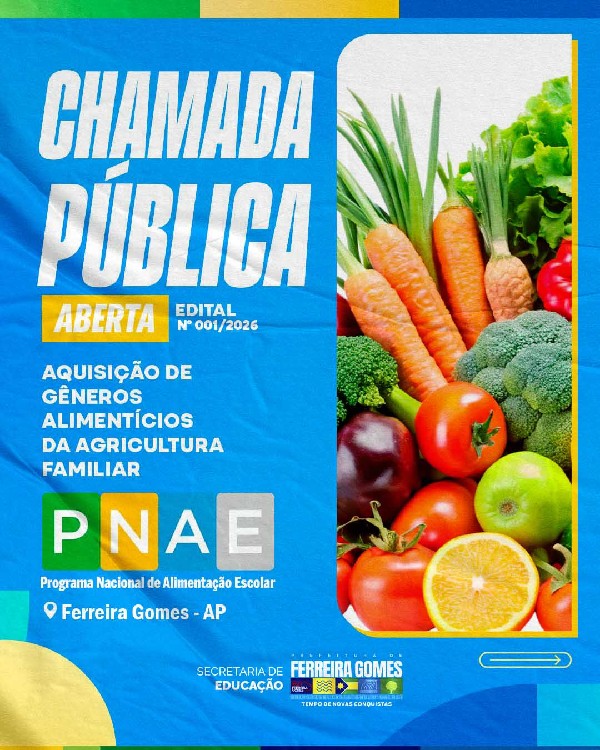 A Prefeitura Municipal de Ferreira Gomes, por intermédio da Secretaria Municipal de Educação, torna público que está aberta a Chamada Pública do Programa Nacional de Alimentação Escolar (PNAE), destinada à aquisição de gêneros alimentícios oriundos da agricultura familiar e do empreendedor familiar rural.